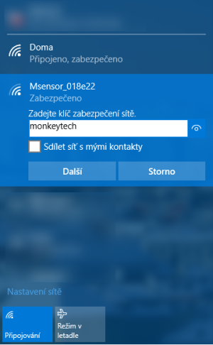 Takže i když je v mém WiFi teploměru jen jedna vstupní zdířka (stereo jack mm), tak jde například s pomocí obyčejných sluchátkových rozdvojek postupně zapojit více teplotních čidel a natáhnout si tak kolem domu, sklepa, chaty či bazénu celou síť měřených bodů, kterou ovládá jen jeden WiFi teploměr. Teploměr je z výroby nastaven v režimu konfigurace a funguje jako Access Point (AP). Po připojení napájení začne vysílat vlastní WiFi síť. K této síti se připojíte a prostřednictvím internetového prohlížeče zvolíte svoji domácí WiFi síť a zadáte heslo.